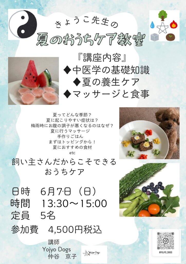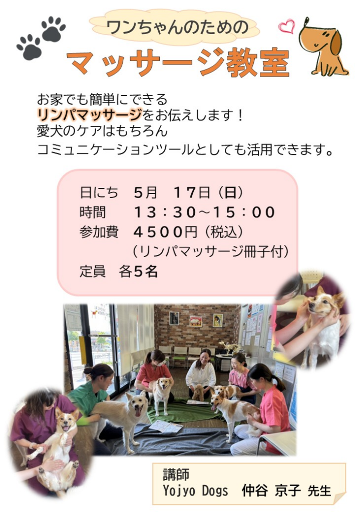 Yojyo Dogs 仲谷 京子先生 ・愛玩動物看護師・JPMA認定ペットマッサージセラピスト・POMCペット中医薬膳管理師・AHIOアニマルハーブボールプラクティショナー・人とペットの四季養生アドバイザー・ビジョナリーアーツ専門学校講師・Yojyo Dogs 主宰・愛犬kai(トイプードル)18歳♂ ワークショップの予定 5月17日 (日) 定員5名 予約受付中 11月30日 (日) 定員5名 予約受付中 11月30日 (日) 定員5名 満員御礼